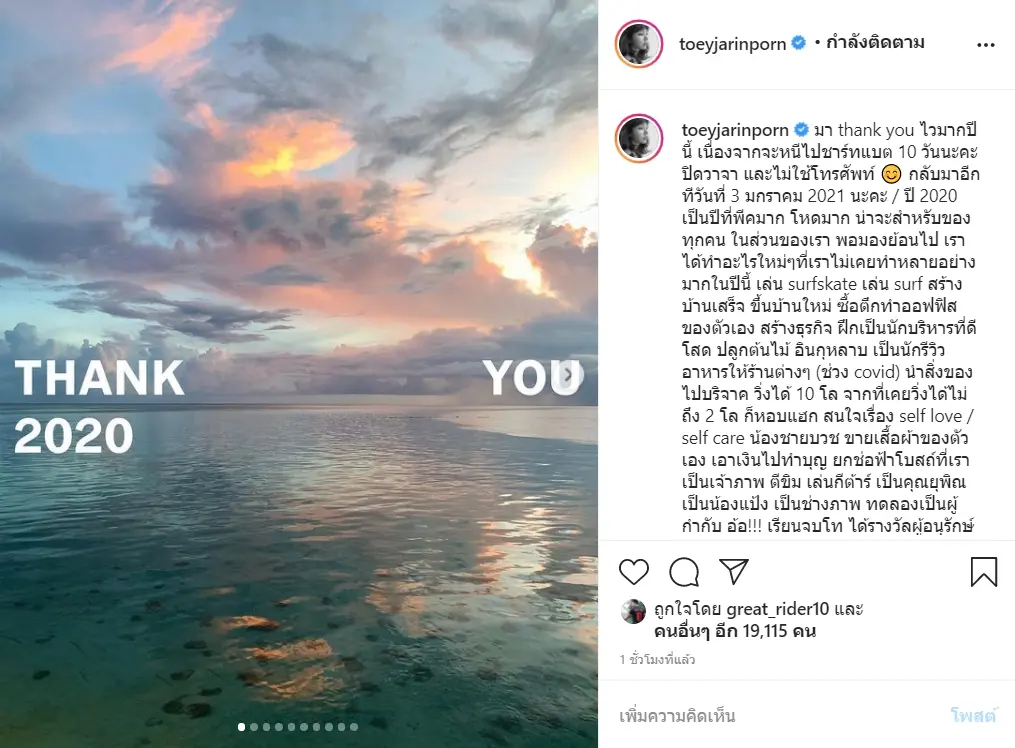 โดยล่าสุด สาวเต้ย ก็ขอโพสต์ขอบคุณส่งท้ายปี 2020 ก่อนจะไปสายบุญยาว ๆ 10 วันทางอินสตาแกรมส่วนตัว ว่า