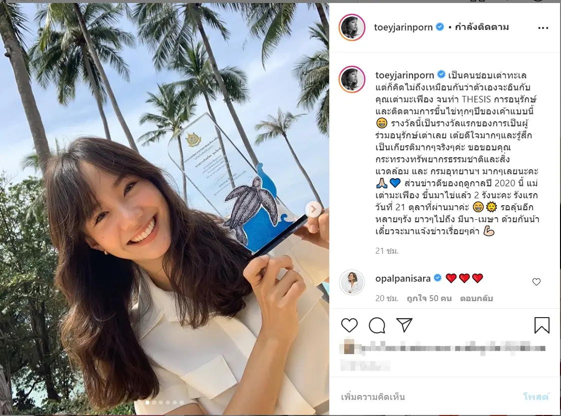 ล่าสุดสาวเต้ยก็ดีใจจนเก็บไม่อยู่ ต้องออกมาโพสต์ข้อความถึงการที่เธอนั้นได้รางวัลเกี่ยวกับเรื่องเต่ามะเฟือง โดยระบุว่า