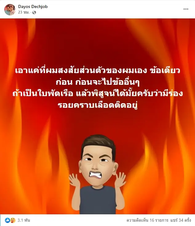 ต่อย ดายศ พี่ชายของ แตงโม นิดา เกิดข้อสงสัยหลังแถลงการณ์สรุปสำนวนคดีจบลง ลั่น! ก่อนไปข้ออื่น หากแผลที่ต้นขาเกิดจากไบพัดเรือ ขอพิสูจน์คราบเลือดได้มั้ย ?