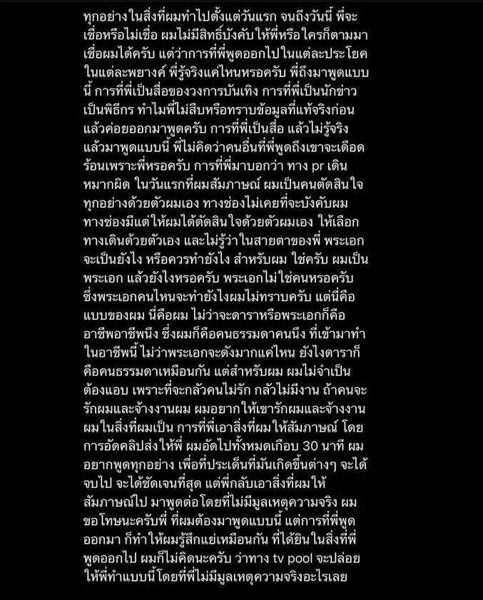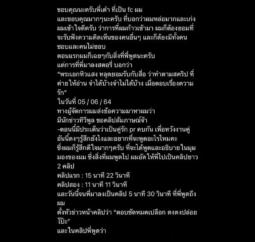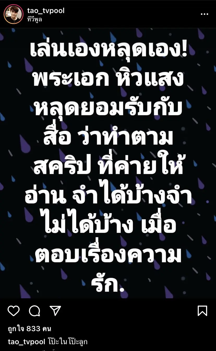 ต่อมา เต๋า ทีวีพูล ได้มีการโพสต์ข้อความผ่านทางอินสตาแกรมว่า “เล่นเองหลุดเอง! พระเอกหิวแสง หลุดยอมรับกับสื่อว่าทำตามสคริปที่ค่ายให้อ่าน จำได้บ้าง จำไม่ได้บ้าง เมื่อตอบเรื่องความรัก. โป๊ะในโป๊ะลูก”