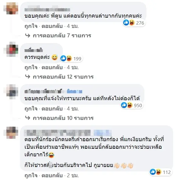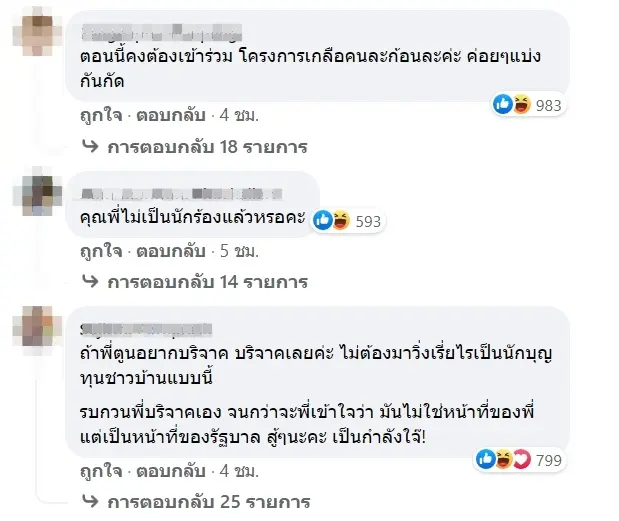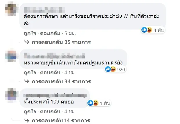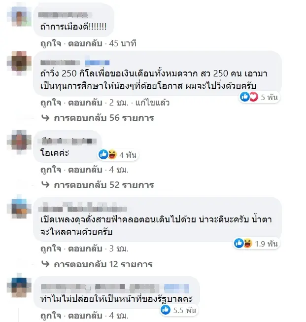โดยเสียงส่วนใหญ่บอกว่า ตรงนี้ไม่ใช่หน้าที่ของประชาชนที่ต้องออกมาเรื่อไรเงินเพื่อมาช่วยกันเหลือคนที่ด้อยโอกาสกว่า แต่หากเป็นหน้าที่คณะรัฐบาลที่ควรจะจักสรรงบประมาณให้ครอบคลุมอย่างทั่วถึง โดยบางส่วนก็มีแอบจิกกัดบางว่า ทั้งประเทศมีเด็กแค่ 109 คนเหรอ , ขอบคุณพี่ตูน แต่ตอนนี้ลำบากกันทุกคนค่ะ , ทำบุญเงินชาวบ้าน ซีซั่น2 , ตอนนี้คงต้องเข้าร่วม โครงการเกลือคนละก้อนละค่ะ ค่อยๆแบ่งกันกัด และอีกมากมาย ซึ่งล้วนแล้วแต่เป็นคอมเมนต์ที่ไม่เห็นด้วยกับโครงการดังกล่าว
