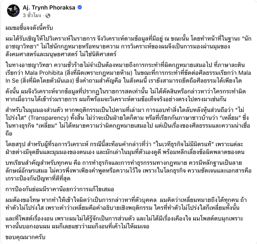 “ในทางอาชญาวิทยา ความชั่วร้ายไม่ได้หมายถึงการกระทำที่ผิดกฎหมายเสมอไป เช่น Mala Prohibita คือสิ่งที่ผิดเพราะกฎหมายห้าม ขณะที่ Mala In Se คือสิ่งที่ผิดโดยตัวมันเอง… คำถามคือ สังคมเรายังยึดถือศีลธรรมได้มากน้อยแค่ไหน” อ. ตฤณห์ โพสต์ชี้แจง