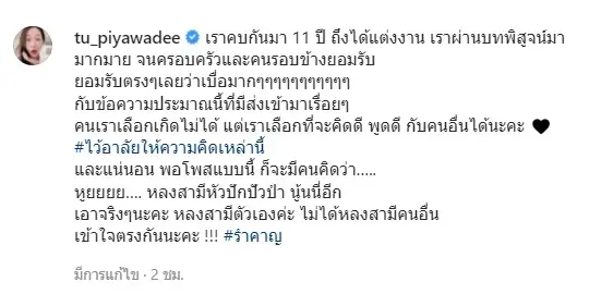 นอกจากนี้ ตู่ ปิยวดี ยังเล่าสถานะความรักของตนและหนุ่ม มาวิน ผ่านทางแคปชั่นอีกด้วยว่า ‘เราคบกันมา 11 ปี ถึงได้แต่งงาน เราผ่านบทพิสูจน์มามากมาย จนครอบครัวและคนรอบข้างยอมรับ ยอมรับตรง ๆ เลยว่าเบื่อมาก ๆ กับข้อความประมาณนี้ ที่มีส่งเข้ามาเรื่อย ๆ‘