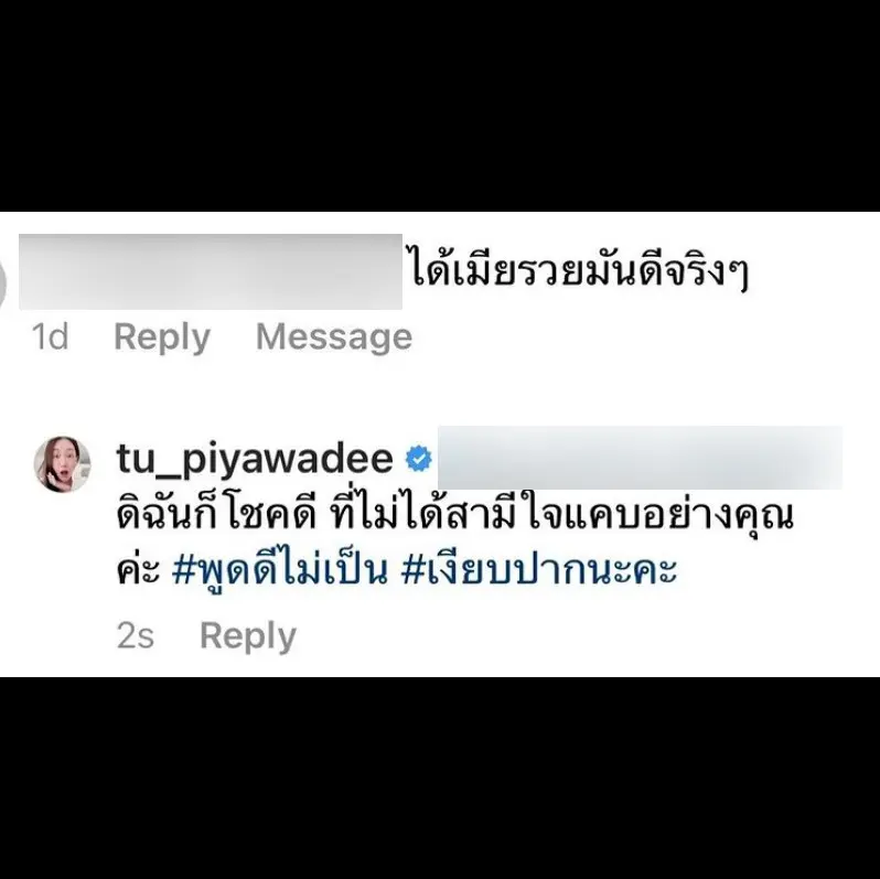 ออกมาตอบกลับเกรียนคีย์บอร์ดแบบนิ่ม ๆ สำหรับผู้จัดคนเก่ง ตู่ ปิยวดี หลังจากที่เจ้าตัวได้แชร์ข้อความของผู้ใช้งานโซเชียลรายหนึ่ง ที่เข้ามาแสดงความคิดเห็นว่า ‘ได้เมียรวยมันดีจริง ๆ’ เป็นเหตุให้เจ้าตัวต้องขอฟาดกลับแบบเบา ๆ ว่า ‘ดิฉันก็โชคดี ที่ไม่ได้สามีใจแคบอย่างคุณค่ะ #พูดดีไม่เป็น #เงียบปากนะคะ’