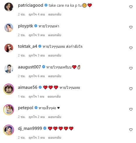 ทางด้านของเพื่อน ๆ ในวงการต่างก็เข้ามาคอมเมนต์ให้กำลังใจ พร้อมอวยพรของให้ ตู่ ปิยวดี หายจากอาการป่วยโดยเร็ว