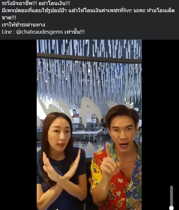 ก่อนหน้านี้ ตู่ ปิยวดี มาลีนนท์ ได้มีการไลฟ์สดเตือนภัยผ่านทางช่องทางเพจเฟซบุ๊ก Mawinfinferrr โดยระบุข้อความว่า “ระวังมิจฉาชีพ!!! อย่าโอนเงิน!!! มีเพจปลอมที่แอบใช้รูปอปป้า แล้วให้โอนเงินค่าเพชรที่ live นะคะ ห้ามโอนเด็ดขาด!!!เราให้ชำระผ่านทางLine : @chateaudesgems เท่านั้น!!!”
