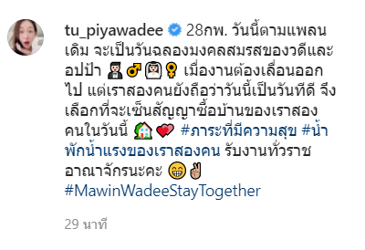 โดยเธอได้มาโพสต์รูปลงในไอจีส่วนตัว โดยเป็นรูปตัวเธอ และคุณสามีที่ยืนกันอยู่หน้าบ้านหลังใหม่ พร้อมกับเขียนแคปชั่นว่า “28กพ. วันนี้ตามแพลนเดิม จะเป็นวันฉลองมงคลสมรสของวดีและอปป้า เมื่องานต้องเลื่อนออกไป แต่เราสองคนยังถือว่าวันนี้เป็นวันทีดี จึงเลือกที่จะเซ็นสัญญาซื้อบ้านของเราสองคนในวันนี้ #ภาระที่มีความสุข #น้ำพักน้ำแรงของเราสองคน รับงานทั่วราชอาณาจักรนะคะ “