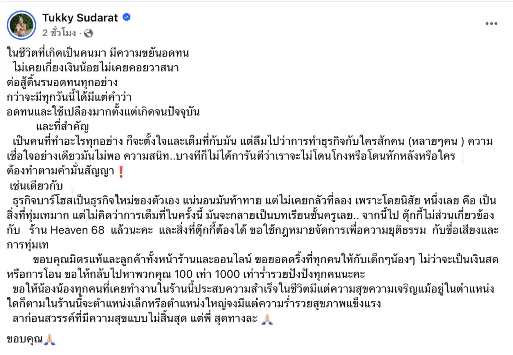 ธุรกิจบาร์โฮสเป็นธุรกิจใหม่ของตัวเอง แน่นอนมันท้าทาย แต่ไม่เคยกลัวที่ลอง เพราะโดยนิสัย หนึ่งเลย คือ เป็นสิ่งที่ทุ่มเทมาก แต่ไม่คิดว่าการเต็มที่ในครั้งนี้ มันจะกลายเป็นบทเรียนชั้นครูเลย.. จากนี้ไป ตุ๊กกี้ไม่ส่วนเกี่ยวข้องกับ ร้าน Heaven 68 แล้วนะคะ และสิ่งที่ตุ๊กกี้ต้องได้ ขอใช้กฎหมายจัดการเพื่อความยุติธรรม กับขื่อเสียงและการทุ่มเท