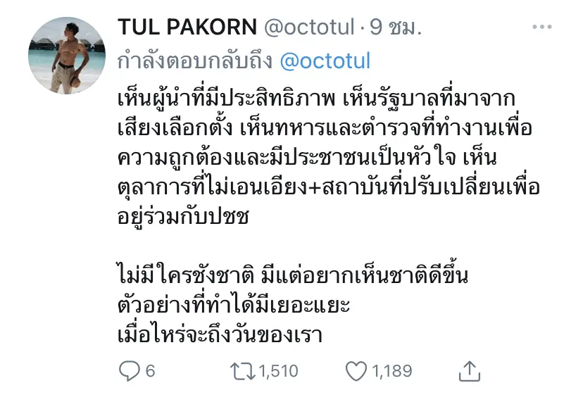 และอีกหนึ่งทวิตต่อกัน “เห็นผู้นำที่มีประสิทธิภาพ เห็นรัฐบาลที่มาจากเสียงเลือกตั้ง เห็นทหารและตำรวจที่ทำงานเพื่อความถูกต้องและมีประชาชนเป็นหัวใจ เห็นตุลาการที่ไม่เอนเอียง+สถาบันที่ปรับเปลี่ยนเพื่ออยู่ร่วมกับปชช ไม่มีใครชังชาติ มีแต่อยากเห็นชาติดีขึ้น ตัวอย่างที่ทำได้มีเยอะแยะ เมื่อไหร่จะถึงวันของเรา”