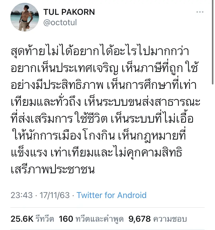 “สุดท้ายไม่ได้อยากได้อะไรไปมากกว่า อยากเห็นประเทศเจริญ เห็นภาษีที่ถูกใช้อย่างมีประสิทธิภาพ เห็นการศึกษาที่เท่าเทียมและทั่วถึง เห็นระบบขนส่งสาธารณะที่ส่งเสริมการใช้ชีวิต เห็นระบบที่ไม่เอื้อให้นักการเมืองโกงกิน เห็นกฎหมายที่แข็งแรง เท่าเทียมและไม่คุกคามสิทธิเสรีภาพประชาชน “