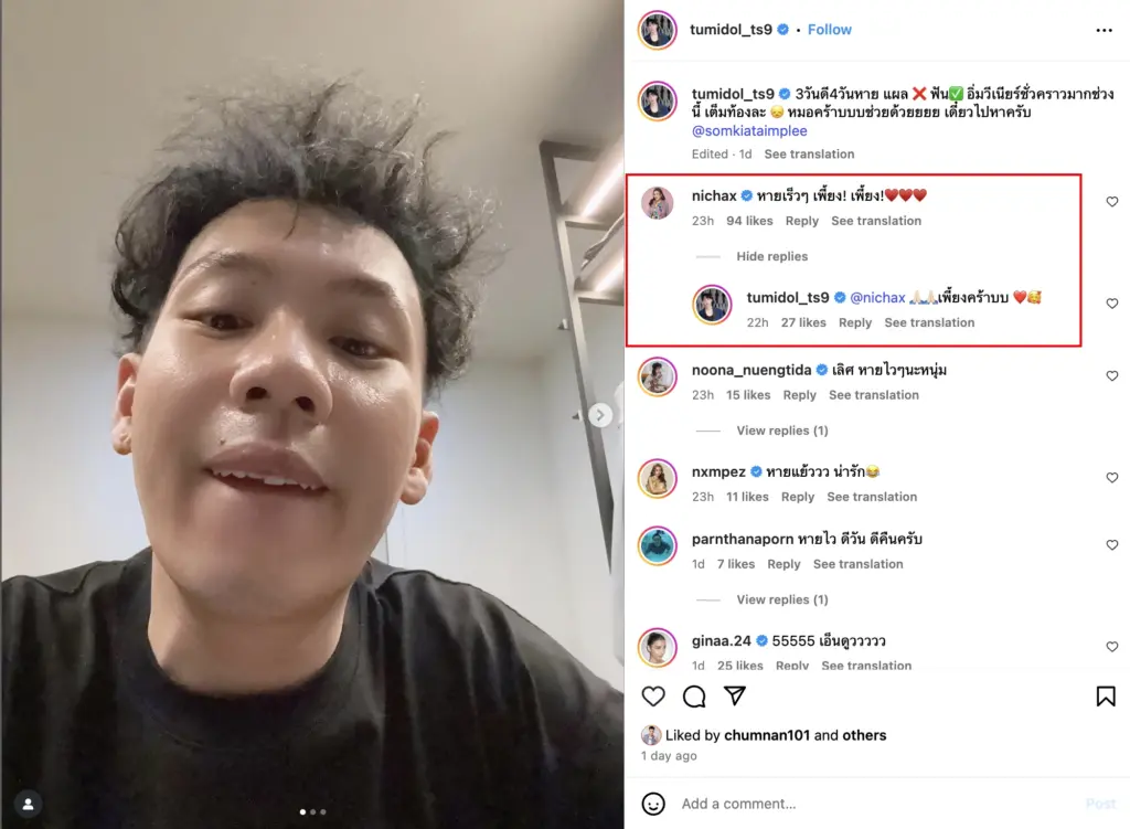 แฟนๆ ต่างร่วมส่งแรงใจให้ “ตั้ม วราวุธ” ฟื้นตัวเต็มที่ และกลับมาสร้างรอยยิ้มและเสียงหัวเราะให้ทุกคนได้เหมือนเดิมในเร็ววัน