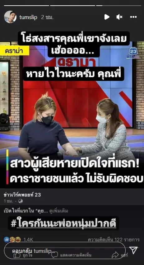 ด้านโจทย์เก่าอย่าง ตั้ม เดอะสตาร์10 โพสต์ไอจีสตอรี่ว่า โธ่สงสารคุณพี่เขาจังเลย เฮ่ออออ หายไว ๆ นะครับคุณพี่ พร้อม #ใครกันนะพ่อหนุ่มปากดี