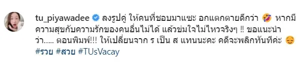 ล่าสุดงานนี้ฟาดต่อเนื่อง แบบตรงๆ ไม่อ้อมค้อม ลงรูปคู่มาวิน แบบสวีตรัวๆกลางสระว่ายน้ำ พร้อมแคปชั่นสับๆว่า ลงรูปคู่ ให้คนที่ชอบมาแซะ อกแตกตายดีกว่า 🤣 หากมีความสุขกับความรักของคนอื่นไม่ได้ แล้วข่มใจไม่ไหวจริงๆ ‼️ ขอแนะนำว่า….. ตอนพิมพ์!!! ให้เปลี่ยนจาก ร เป็น ส แทนนะคะ คดีจะพลิกทันทีค่ะ 😌 #รวย #สวย #TUsVacay งานนี้ทำเอาสะดุ้งกันไปไม่น้อย