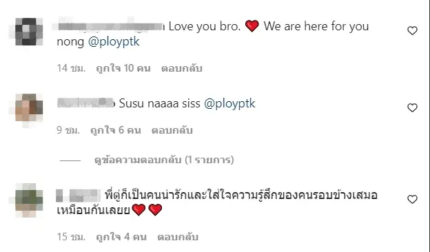ใต้โพสต์ก็ยังมีแฟนคลับเข้ามาให้กำลังกับสาวพลอยเพิ่มเติมด้วยเช่นกัน โดยทางด้านของ พลอย ก็ได้มีออกตอบคอมเมนต์ในโพสต์นี้ว่า “Thank you so much big bro🙏🏻”