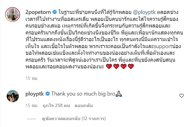 “ในฐานะพี่ชายคนนึงที่ได้รู้จักพลอย @ployptk ตลอดช่วงเวลาที่ไปทำงานที่ออสเตรเลีย พลอยเป็นคนน่ารักและใส่ใจความรู้สึกของคนรอบข้างเสมอ เหตุการณ์ที่เกิดขึ้นจึงกระทบกับความรู้สึกพลอยและครอบครัวมากถึงขั้นเป็นวิกฤตช่วงนึงของชีวิต พี่ตู่และเพื่อนๆนักแสดงทุกคนที่ไปร่วมแสดงหนังเรื่องนี้รู้ดีว่าอะไรเป็นอะไร ทุกคนตรงนี้มีแต่ความเข้าใจ เห็นใจ และเชื่อใจในตัวพลอย พวกเราจะคอยเป็นกำลังใจและsupportน้อง ขอให้พลอยเข้มแข็งและตั้งใจทำงานของน้องอย่างเต็มที่เพื่อตัวเองและครอบครัว วันเวลาจะพิสูจน์เองว่าเราเป็นใคร พี่ตู่และพี่นุชยังคงสนับสนุนพลอยและรอคอยผลงานของน้องนะ ❤️❤️❤️❤️”