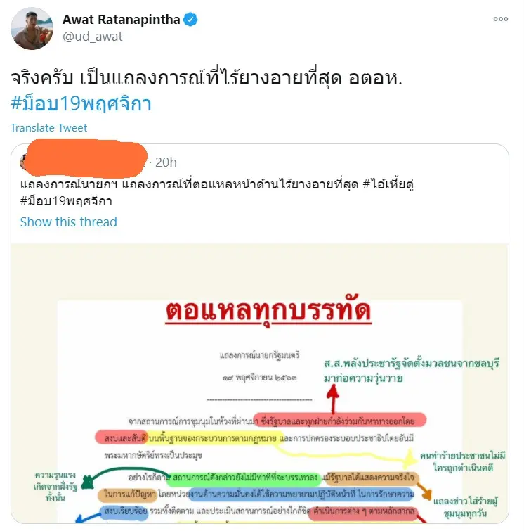 ล่าสุดเจ้าตัวได้มีการแชร์ภาพจากผู้ใช้ทวิตเตอร์รายหนึ่ง พร้อมระบุข้อความว่า “จริงครับ เป็นแถลงการณ์ที่ไร้ยางอายที่สุด อตอห. #ม็อบ19พฤศจิกา” ซึ่งก็ได้มีเหล่าแฟนคลับผู้ร่วมอุดมการณ์เดียวกันต่างเข้ามาแสดงความเห็นอย่างมากมาย