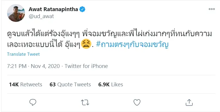 จากกรณีเมื่อวันที่ 4 พ.ย.63 ไผ่ ดาวดิน และ อุ๊ หฤทัย ได้ไปออกรายการ ถามตรงๆกับจอมขวัญ ทำให้ อัด อวัช นักแสดงและผู้กำกับแห่งค่ายนาดาว ได้ออกมาโพสต์ข้อความ พร้อมทั้งยังชื่นชม จอมขวัญและไผ่ ที่รับมือกับอีกฝ่ายได้ดีมาก