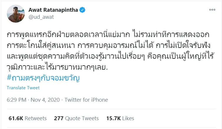 โดยล่าสุด อัด ได้ออกมาทวีตข้อความผ่าน ทวิตเตอร์ Awat Ratanapintha ด้วยการจวก อุ๊ หฤทัย ที่พูดแทรกตลอดช่วงเวลาในการที่จอมขวัญสัมภาษณ์ ไผ่ ดาวดิน โดยระบุว่า