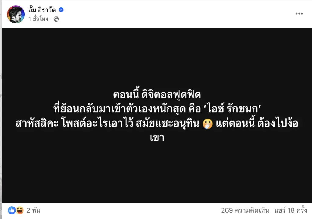 และแม้เหตุการณ์จะผ่านมาไม่กี่ชั่วโมง แต่ความเคลื่อนไหวในโลกโซเชียลก็ร้อนแรงไม่แพ้กัน เมื่อ “อั้ม อิราวัต” นักเคลื่อนไหวทางการเมืองชื่อดัง ออกมาโพสต์ข้อความในเชิงแขวะถึง “ไอซ์ รักชนก” ว่า