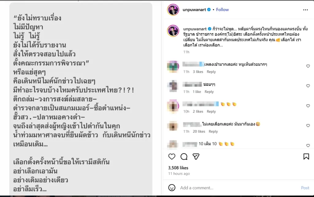 “ก็ว่าจะไม่พูด… หลับตาจิ้มตรงไหนก็หนองแตกตรงนั้น ทั้งรัฐบาล ข้าราชการ องค์กร(ไม่)อิสระ เลือกตั้งครั้งหน้าประเทศไทยต้องเปลี่ยน ไม่งั้นตายเคสดำกันหมดประเทศไม่เกินจริง คุณเลือกได้ เราเลือกได้ เราต้องเลือก”