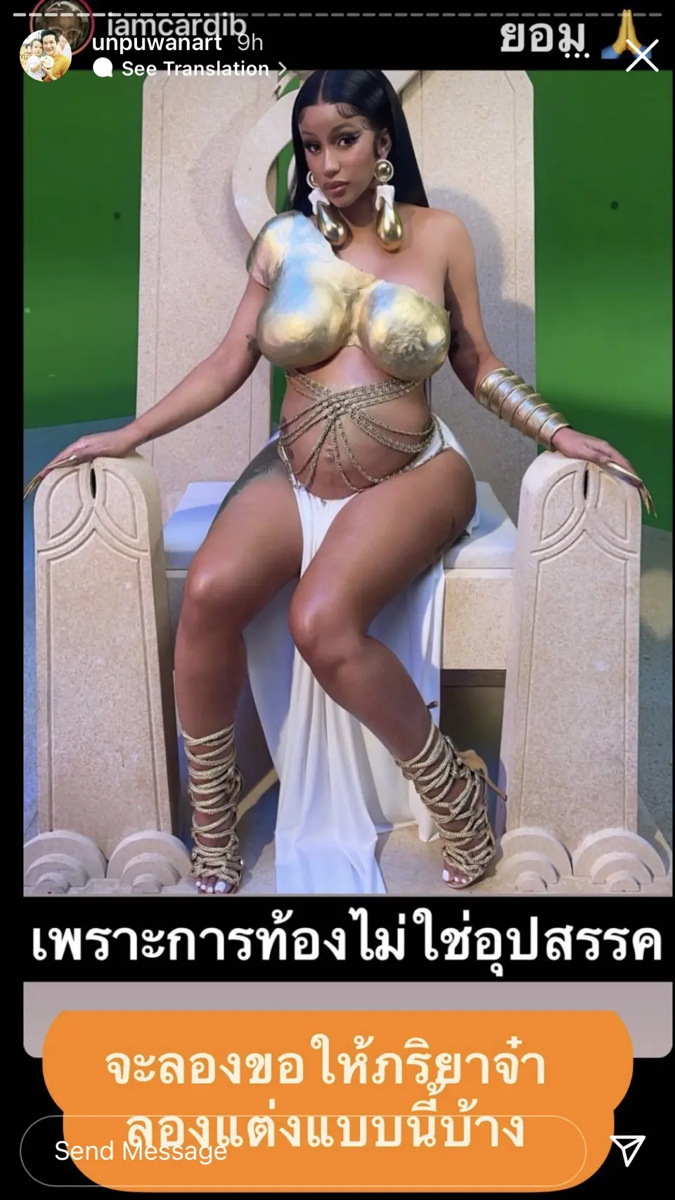 และล่าสุดชุดที่ทำเอา อั๋น ถึงกับโดนตก ถูกใจจนต้องออกมาโพสต์ผ่าน Instagram นั้น คือชุดที่ Cardi B แต่งเป็นชาวกรีกนั่งอยู่บนบัลลังค์ ทั้งยังสวมผ้าเตี่ยวและทับทรวงสีทอง พร้อมใส่แคปชันว่า เพราะการท้องไม่ใช่อุปสรรค จะลองขอให้ภริยาจ๋า ลองแต่งแบบนี้บ้าง