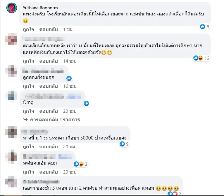 หลังจากที่โพสต์ไปก็มีคุณพ่อคุณแม่จำนวนมาก เข้ามาร่วมกันแสดงความคิดเห็น บ้างก็เข้ามาเห็นใจ บ้างก็บอกว่าหัวอกเดียวกัน บ้างก็แนะนำให้ย้ายจริง ๆ ลองมองหาที่อื่น เพราะแค่ อนุบาล2 ยังราคาแรงขนาดนี้ เทียบเท่ากับส่งเรียนต่างประเทศได้เลย อย่างเช่น ป๊าเต็ด ยุทธนา ก็เข้ามาร่วมแสดงความคิดเห็นด้วย แต่บางส่วนก็บอกว่าระดับ อั๋น ภูวนาทแล้ว สบม. แค่นี้จิ๊บ ๆ