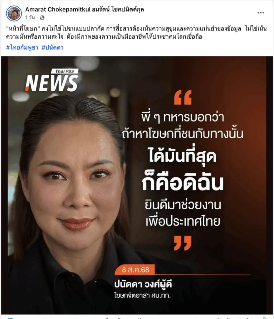 แต่ดูเหมือนงานยังไม่เริ่มดี ก็โดนดราม่ากระแทกเข้าเต็มๆ เมื่อ “เจี๊ยบ – อมรัตน์ โชคปมิตต์กุล” อดีต ส.ส.พรรคก้าวไกล โพสต์แสดงความเห็นผ่านเฟซบุ๊ก ว่าการเป็นโฆษกไม่ใช่การชนกันแบบ “ปลากัด” แต่ต้องอาศัยความสุขุมและความเป็นมืออาชีพ ไม่ใช่การสื่อสารเพื่อความสะใจ