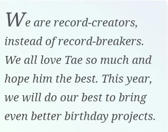 ด้วยหัวใจสีทองที่พยายามเปลี่ยนแปลงโลก แม้ว่าจะเพียงเล็กน้อยแต่เพื่ออนาคตที่ดีกว่า ดังที่นิตยสารอังกฤษกล่าวไว้ ว่า V BTS มีฐานแฟนคลับที่ใหญ่ที่สุดและภักดีที่สุดคนหนึ่ง ซึ่งเป็นที่รู้จักทั่วโลกในด้านความดีและการบริจาคในนามไอดอลของพวกเขา