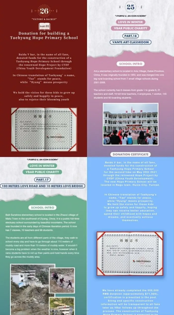 สิ่งนี้เกิดขึ้นหลังจากแฟนคลับสร้างโรงเรียนประถมแทฮยองโฮปในปี 2020 เช่นเดียวกับถนน 100 เมตร” ถนนคิมแทฮยอง” และสะพานยาว 10 เมตร “สะพานคิมแทฮยอง” สำหรับนักเรียนชั้นประถมศึกษาในหมู่บ้านจ้าวซี ประเทศจีน