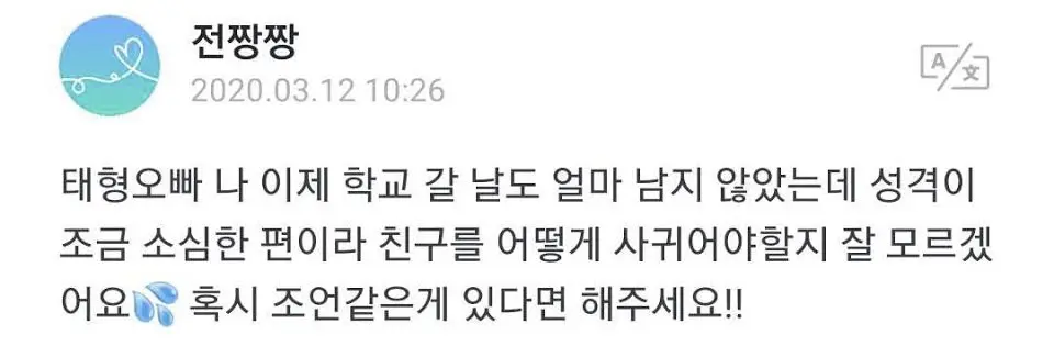 แทฮยองอปป้า ฉันเหลือเวลาอีกไม่กี่วันก่อนไปโรงเรียน เป็นคนขี้อาย ไม่รู้จะหาเพื่อนยังไง💦 ขอคำแนะนำหน่อย!!