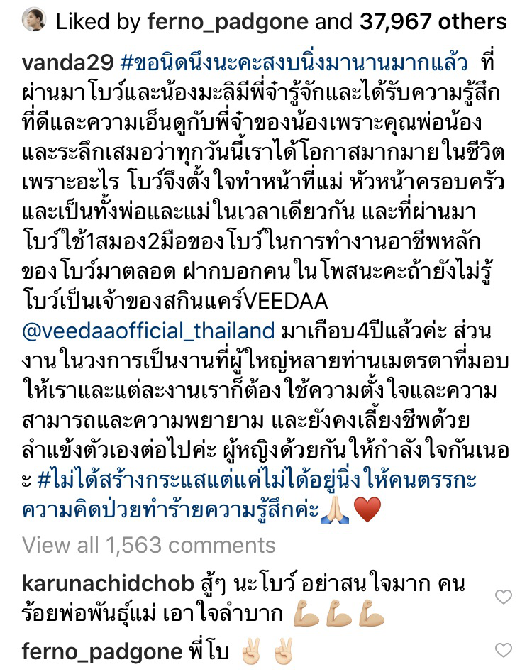 งานนี้แม่โบว์ไม่ขอทน ต้องออกมาโพสต์ลงไอจีแสดงความไม่พอใจในทันที โดยเธอได้มาลงรูปที่แคปคอมเมนต์นั้นมา พร้อมกับเขียนว่า “#ขอนิดนึงนะคะสงบนิ่งมานานมากแล้ว ที่ผ่านมาโบว์และน้องมะลิมีพี่จ๋ารู้จักและได้รับความรู้สึกที่ดีและความเอ็นดูกับพี่จ๋าของน้องเพราะคุณพ่อน้อง และระลึกเสมอว่าทุกวันนี้เราได้โอกาสมากมายในชีวิตเพราะอะไร โบว์จึงตั้งใจทำหน้าที่แม่ หัวหน้าครอบครัว และเป็นทั้งพ่อและแม่ในเวลาเดียวกัน และที่ผ่านมาโบว์ใช้1สมอง2มือของโบว์ในการทำงานอาชีพหลักของโบว์มาตลอด ฝากบอกคนในโพสนะคะถ้ายังไม่รู้ โบว์เป็นเจ้าของสกินแคร์VEEDAA @veedaaofficial_thailand มาเกือบ4ปีแล้วค่ะ ส่วนงานในวงการเป็นงานที่ผู้ใหญ่หลายท่านเมตรตาที่มอบให้เราและแต่ละงานเราก็ต้องใช้ความตั้งใจและความสามารถและความพยายาม และยังคงเลี้ยงชีพด้วยลำแข้งตัวเองต่อไปค่ะ ผู้หญิงด้วยกันให้กำลังใจกันเนอะ #ไม่ได้สร้างกระแสแต่แค่ไม่ได้อยู่นิ่งให้คนตรรกะความคิดป่วยทำร้ายความรู้สึกค่ะ”