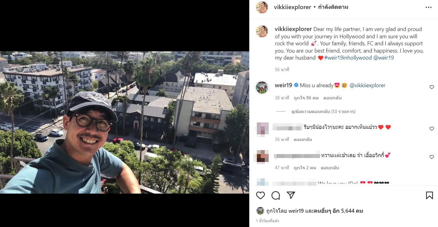 ล่าสุด วิกกี้ ได้โพสต์ภาพสามีลงอินสตราแกรมส่วนตัวพร้อมข้อความเป็นภาษาอังกฤษว่า Dear my life partner, I am very glad and proud of you with your journey in Hollywood and I am sure you will rock the world 🚀. Your family, friends, FC and I always support you. You are our best friend, comfort, and happiness. I love you, my dear husband