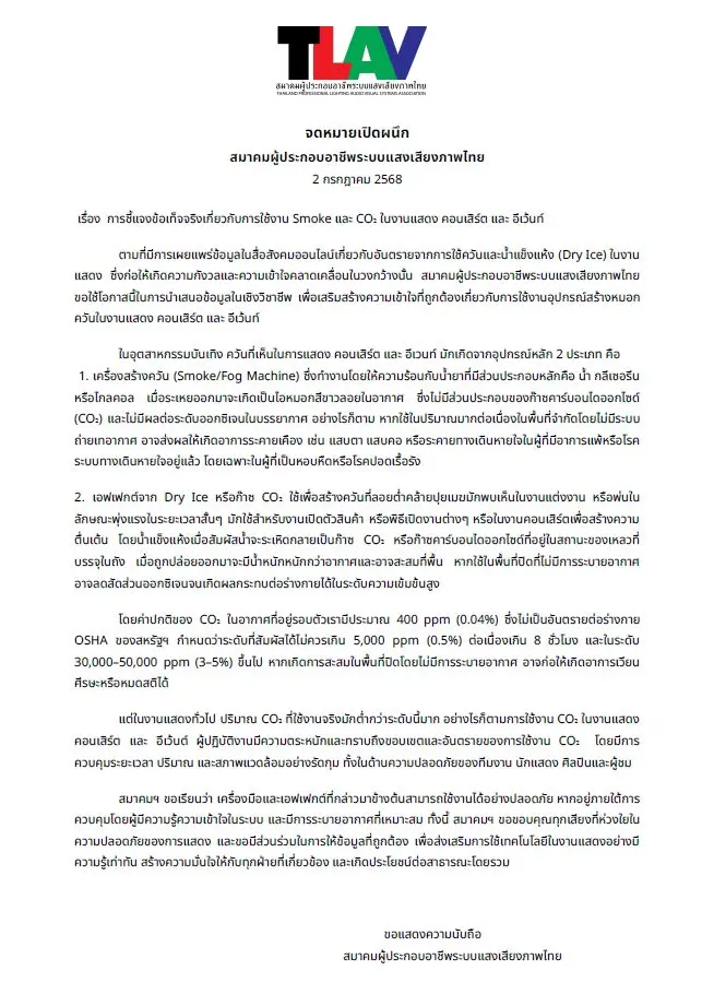 “เลยอยากขอใช้โอกาสนี้ ในการแชร์ บอกต่อความเข้าใจ กับคนที่รักการมาดูคอนเสิร์ต ว่า Dry Ice และ Smoke คืออะไร และต่างกันยังไง ผ่านเพจสมาคมเลยนะคะ”