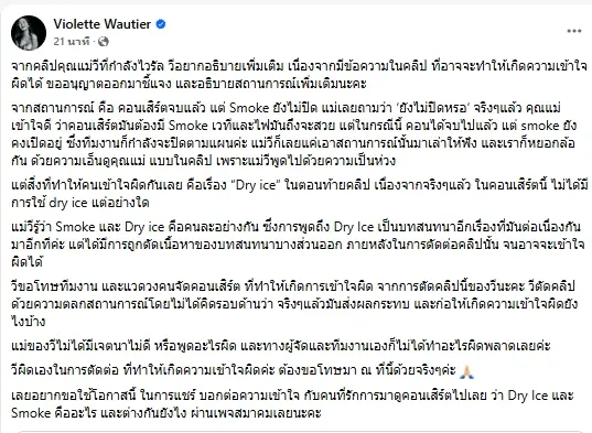ล่าสุด “วี วิโอเลต” ได้โพสต์ข้อความผ่านเฟซบุ๊ก ชี้แจงถึงกรณีคลิปไวรัลนั้น โดยระบุว่า