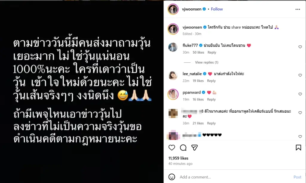 “ถ้ามีเพจไหนเอาข่าววุ้นไปลงที่ไม่เป็นความจริง วุ้นขอดำเนินคดีตามกฎหมายนะคะ”
