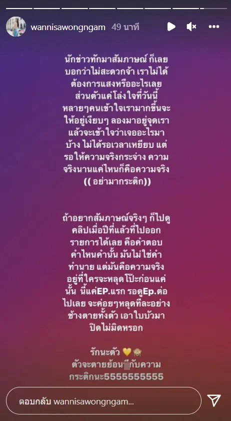 ก่อนที่อดีตแฟนสาว แอนนา จะออกมาเคลื่อนไหว กระทั่งล่าสุดเจ้าตัวได้โพสต์อีกครั้งว่า นักข่าวทักมาสัมภาษณ์ ก็เลยบอกว่าไม่สะดวกจ้า เราไม่ได้ต้องการแสงหรืออะไรเลย ส่วนตัวแค่โล่งใจที่วันนี้หลายๆคนเข้าใจเรามากขึ้น จะให้อยู่เงียบๆ ลองมาอยู่จุดเราแล้วจะเข้าใจว่าเจออะไรมาบ้าง ไม่ได้รอเวลาเหยียบ แต่รอให้ความจริงกระจ่าง ความจริงนานแค่ไหนก็คือความจริง ( ( อย่ามากระติก))