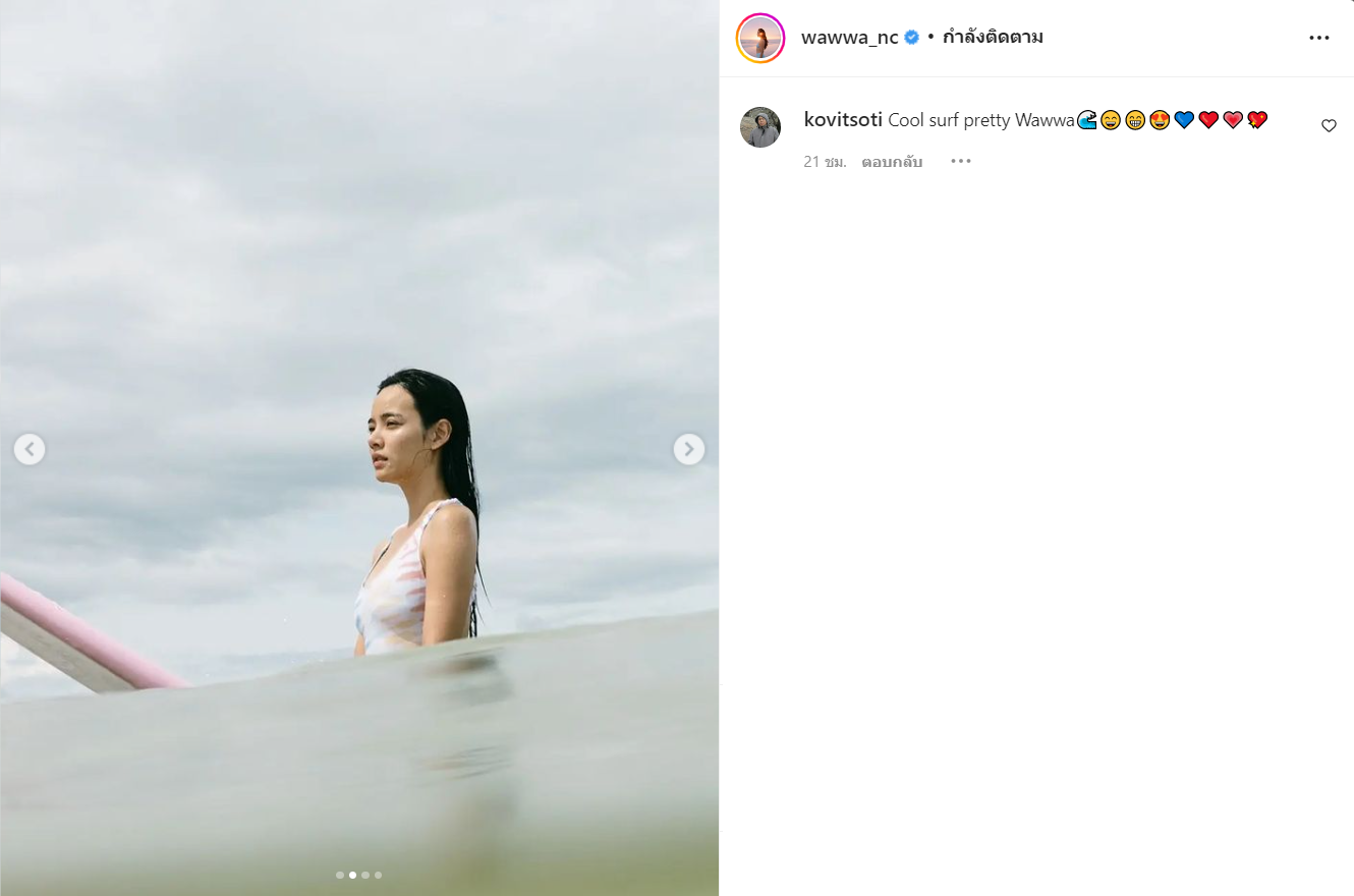 เผยให้เห็นโมเมนต์ขณะอยู่บนเซิร์ฟบอร์ดกลางทะเล พร้อมท่าโพสสุดปัง แต่ที่ทำเอาสะดุดตาเห็นจะเป็นชุดวันพีซที่ วาววา ณิชารีย์ สวมใส่ ทำเอาแฟน ๆ เข้ามากดไลก์พร้อมส่งอีโมจิรูปหัวใจกันอย่างคับคั่ง นอกจากนี้เจ้าตัวยังได้โพสต์แคปชันประกอบอีกด้วยว่า “Cool surf pretty Wawwa”