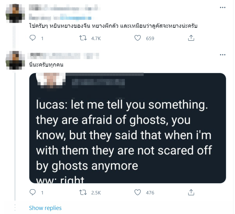 สุดท้ายนี้ แฟน ๆ ก็ได้ทำการสันนิษฐานกันว่า ‘เพราะลูคัส’ หนุ่มอารมณ์ดีนั้นไม่อยู่ เพราะปกติเคยมีคำบอกเล่าว่าลูคัสมีพลังหยางเยอะ สามารถป้องกันผีได้นั่นเอง