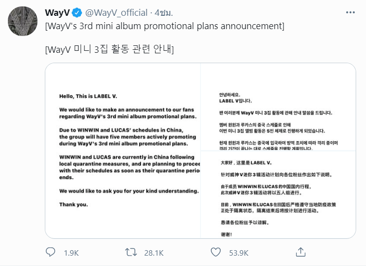 ล่าสุดเมื่อวันที่ 11 มีนาคม ทาง Label V ค่ายของวง WayV ภายใต้ SM Entertainment ก็ได้ออกแถลงการณ์อย่างเป็นทางการแล้วว่า ในการโปรโมท ‘3rd mini album ‘Kick Back’ จะมีสมาชิกที่แอคทีฟตารางงานโปรโมทเพลงเพียง 5 คน ได้แก่ เตนล์, เฮนเดอรี่, คุน, หยางหยาง และ เซียวจวิ้น เท่านั้น แต่วินวินกับลูคัสจะไม่ได้เข้าร่วมด้วย เนื่องจากทั้งสองคนยังอยู่ในช่วงกักตัวตามมาตรการควบคุมตัวโรคระบาดโควิด-19 14 วัน มีเนื้อหา ดังนี้
