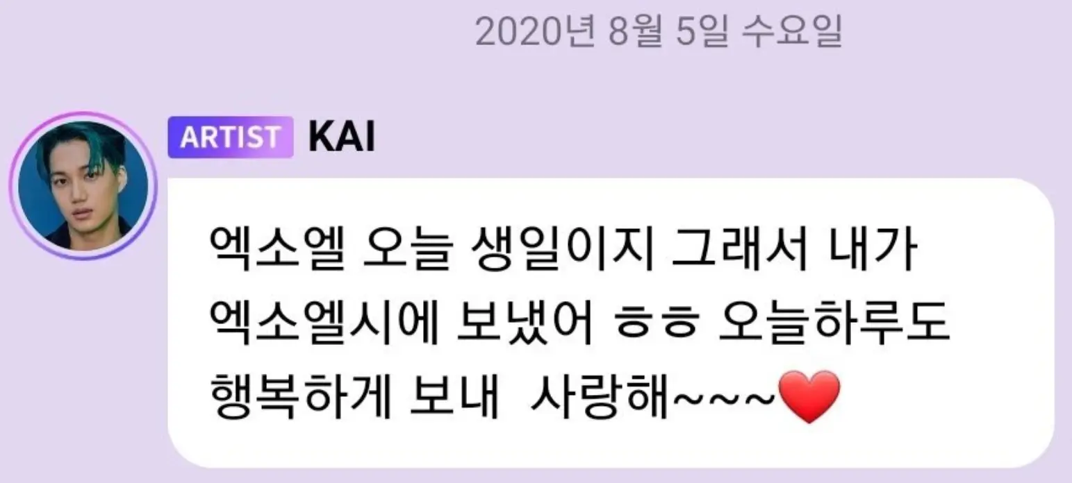 - คิม จง อิน – ไค KAI : จงอินโพสต์ข้อความในเวลา 08.05 น. ซึ่งก็ตรงกับวันที่ 5 เดือน 8 ในวันนี้ ” วันนี้วันเกิดใช่มั้ยครับ ผมก็เลยส่งข้อความนี้มาให้ตอนเวลาของ EXO-L น่ะ วันนี้ทั้งวันขอให้มีความสุขนะ รักนะครับ~~~ “