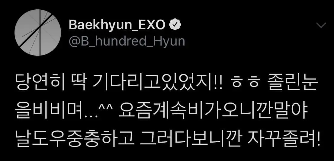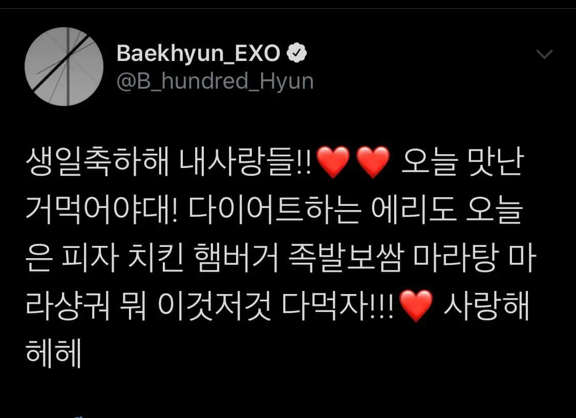 - บยอน แบคฮยอน – แบคฮยอน BAEKHYUN : ได้โพสต์ข้อความผ่านทวิตเตอร์ว่า ” สุขสันต์วันเกิดเจ้าความรักของผม!! วันนี้ต้องกินของอร่อยๆนะ! เอลี่คนไหนที่ไดเอทอยู่ก็กินเถอะ พิซซ่า ไก่ทอด แฮมเบอร์เกอร์ ขาหมู ม๋าลาทัง หม่าล่าทัง หม่าล่าแบบผัด กินนู่นกินนี่ กินให้หมดเลย!!! รักนะ แฮ่แฮ่ แน่นอนอยู่แล้วว่าผมรอเวลาอยู่น่ะซี้!! 555 ขยี้ตาปรือๆไปด้วย…^^ ช่วงนี้ฝนตกตลอด อากาศก็ครึ้มๆทั้งวันก็เลยง่วงบ่อย! “
