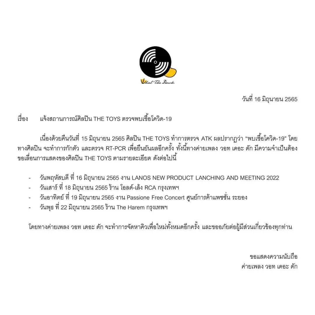 ค่ายเพลง วอท เดอะ ดัก ออกมาแจ้งข่าวศิลปินในค่าย ติดเชื้อโควิด-19 ด้วยการร่อนจดหมายแจ้งข่าวของ THE TOYS – เดอะทอยส์ โดยเผยว่า