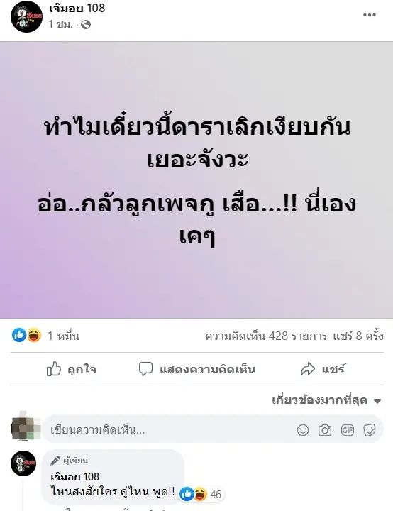 เรียกได้ว่าเป็นอีกหนึ่งการบ้านใหม่ที่ทำเอาขาเผือก ขาเม้าท์ต่างออกมาเคลื่อนไหวกันแต่เช้าตรู่เลยทีเดียวหลังจากที่ เพจดังอย่าง เจ๊มอย 108 ได้ออกมาโพสต์ข่าวแฉแหลก คู่รักดัง ซุ่มเลิกเงียบ ก็ทำเอาคอมเมนต์แตกกันเลยทีเดียว
