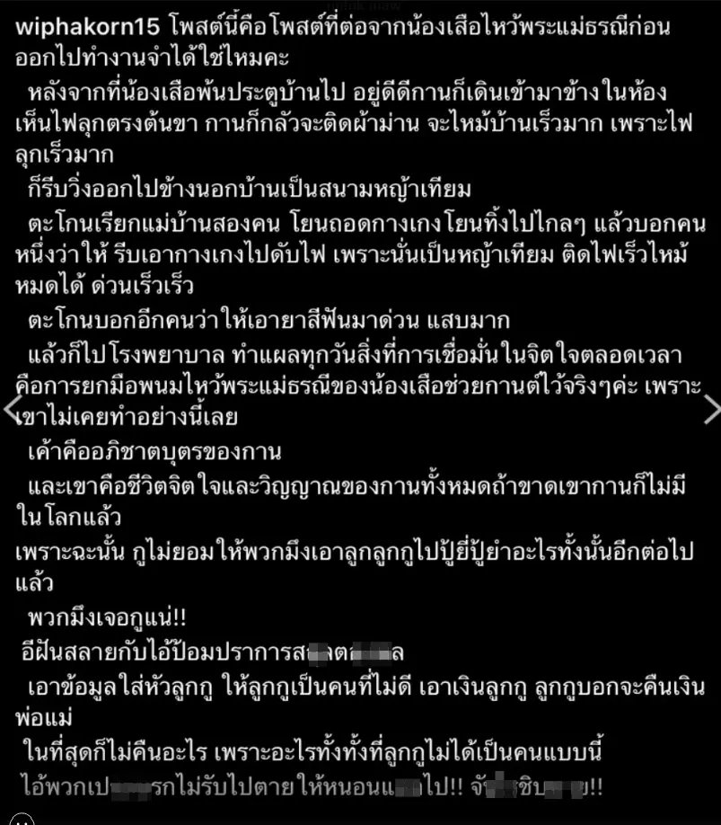โดยเจ้าตัวได้เอามาโพสต์ไว้ไอจี wiphakorn15 ก่อนที่จะลบออกไปในตอนหลัง โดยเล่าเหตุการณ์ย้อนไปถึงตอนที่ เสือ ลูกชาย ได้ทำการไหว้พระแม่ธรณีในช่วงนี้เกิดเหตุ