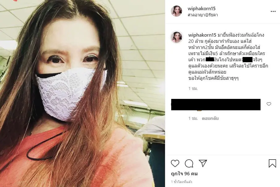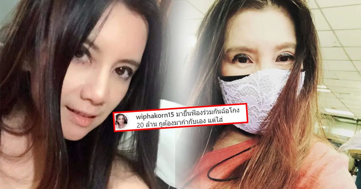 ต่อมาอีกโพสต์เป็นภาพที่เจ้าตัวเดินทางไปที่ศาล พร้อมแคปชั่น มายื่นฟ้องร่วมกันฉ้อโกง 20 ล้าน ต้องมากำกับเอง แต่ใส่หน้ากาก2ชั้น มันอึดอัดนะแต่ก็ต้องใส่เพราะไม่มีเงิน5 ล้านรักษาตัวเหมือนใครเค้า พวกเหี้xมันโกงไปหมดจัxไรจริงๆ