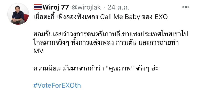 “เมื่อตะกี๊ เพิ่งลองฟังเพลง Call Me Baby ของ EXO ยอมรับเลยว่าวงการดนตรีเกาหลีเขาแซงประเทศไทยเราไปไกลมากจริงๆ ทั้งการแต่งเพลง การเต้น และการถ่ายทำ MV ความนิยม มันมาจากคำว่า “คุณภาพ” จริงๆ อ่ะ #VoteForEXOth”