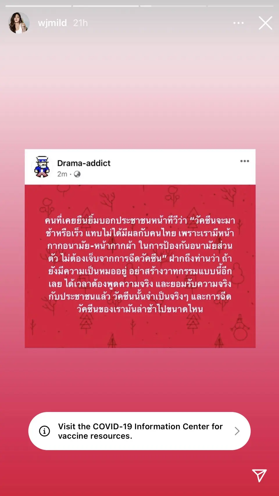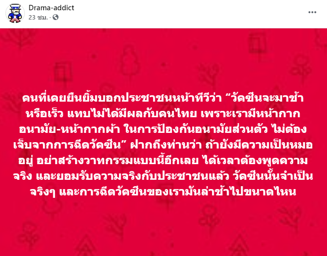 “คนที่เคยยืนยิ้มบอกประชาชนหน้าทีวีว่า “วัคซีนจะมาช้าหรือเร็ว แทบไม่ได้มีผลกับคนไทย เพราะเราก็มีหน้ากากอนามัย หน้ากากผ้า ในการป้องกันอนามัยส่วนตัว ไม่ต้องเจ็บจากการฉีดวัคซีน” ฝากถึงท่านว่า ถ้ายังมีความเป็นหมออยู่ อย่าสร้างวาทกรรมแบบนี้อีกเลย ได้เวลาต้องพูดความจริง และยอมรับความจริงกับประชาชนแล้ว วัคซีนนั้นจำเป็นจริง ๆ และการฉีดวัคซีนของเรามันล่าช้าไปขนาดไหน”