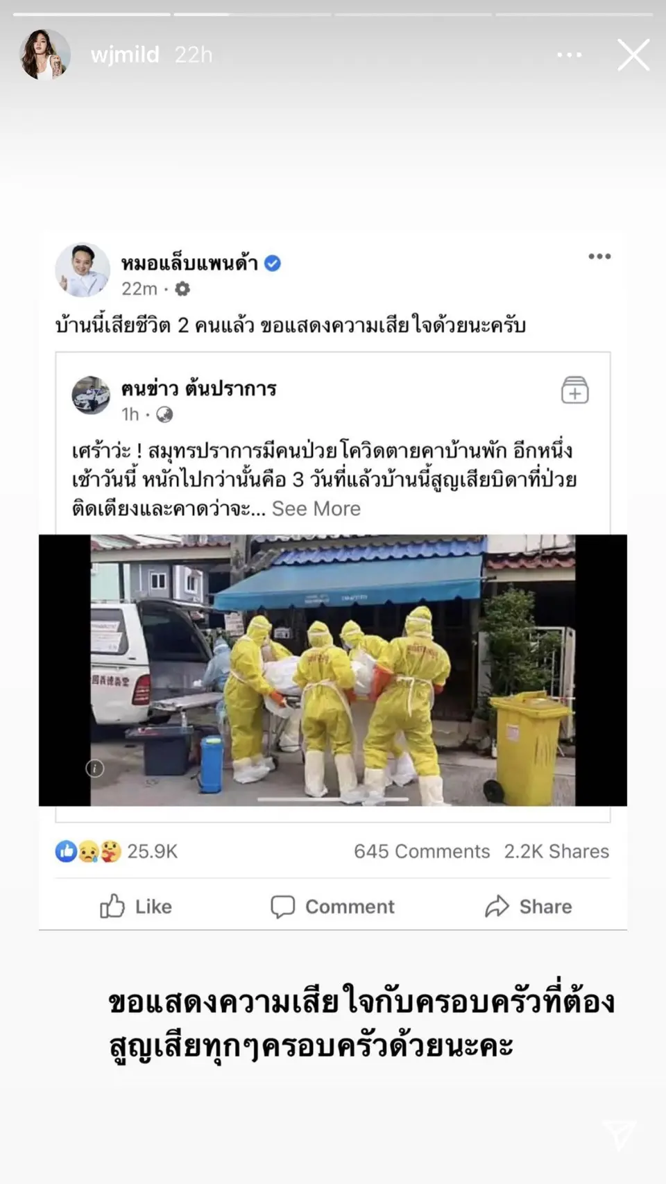ทาง มายด์ ลภัสลัล หรือวีเจมายด์ ที่เป็นอีกหนึ่งดาราหญิงคนสวย ที่ติดตามประเด็นด้านสังคม การเมืองอยู่สม่ำเสมอ ก็ได้ออกมาลงไอจีสตอรี่ แชร์โพสต์ของ ‘หมอแล็บแพนด้า’ ไว้อาลัยถึงผู้ป่วยโควิด-19 ที่เสียชีวิตคาบ้านพัก พร้อมแคปชั่นว่า “ขอแสดงความเสียใจกับครอบครัวที่ต้องสูญเสียทุก ๆ ครอบครัวด้วยนะคะ”