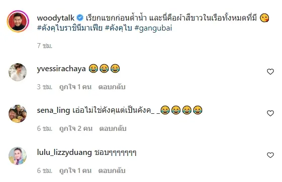 ไม่ใช่แค่คนบันเทิงฝั่งของผู้หญิงเท่านั้น ทางด้านของ วู้ดดี้ มิลินทจินดา ก็ขอออกมาคัฟเวอร์ลุคที่กำลังเป็นกระแสอยู่ตอนนี้ด้วยเหมือนกัน ถึงแม้ตัวเองจะอยู่บนเรือ ก็พยายามหาผ้าสีขาวมาเเต่งเป็นของคังคุไบจนได้ ทำเอาคนที่ติดตามเข้ามาคอมเมนต์แบบถล่มทลายกันไปเลย แต่งานนี้ดูเหมือนจะโดนทางด้านของ เสนาลิง เข้ามาแซวแรง บอกว่า “เอ่อไม่ใช่คังคุแต่เป็นคังค_ _” เป็นการเข้ามาแซวกันขำ ๆ ระหว่างคนสนิทก็ว่าได้ เพราะกระแสของคังคุไบนั้นฟีเวอร์เกินกว่าใครจะห้ามใจไหวจริง ๆ