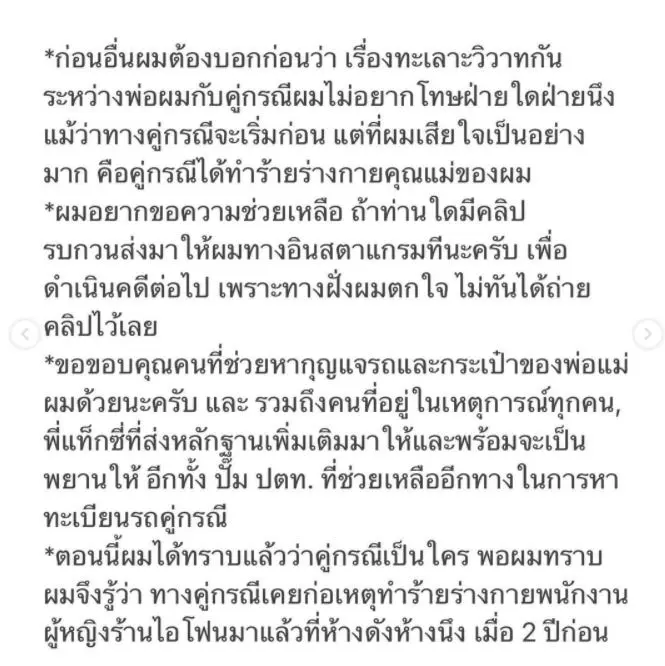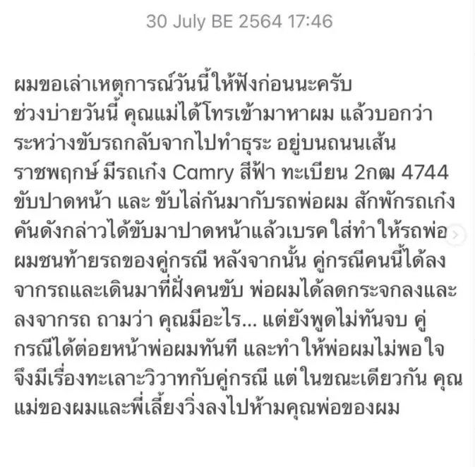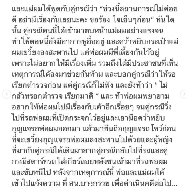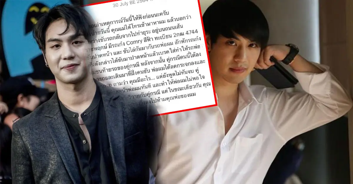 ถึงกับตกใจเมื่อนักแสดงหนุ่ม ไวท์ ณวัชร์ พุ่มโพธิงาม ออกมาโพสต์เรื่องราวของคุณพ่อ คุณแม่ ที่ขับรถไปทำธุระแถวถนนราชพฤกษ์ จากนั้นมีรถเก๋งขับปาดหน้า และไล่กันมากับรถพ่อของตน กระทั้งต้องจอดรถมีปากเสียงกัน แต่ฝ่ายคู่กรณีมีการทำร้ายร่างกายโดยต่อยเข้าที่หน้าของพ่อ จากนั้นแม่ไปห้ามกลับโดนคู่รกณี ตบหน้าอย่างแรง จนมีอาการหู่อื้อ พร้อม กระชากกระเป๋าโยนลงสะพาน และยัง ดึงกุญแจรถของพ่อตนออกมาโชว์ ก่อนที่จะโยนลงสะพานไป ไม่พอยัง ถอยรถมาชนรถพ่อตนจนเกิดความเสียหาย ก่อนที่จะขับรถหนีไป